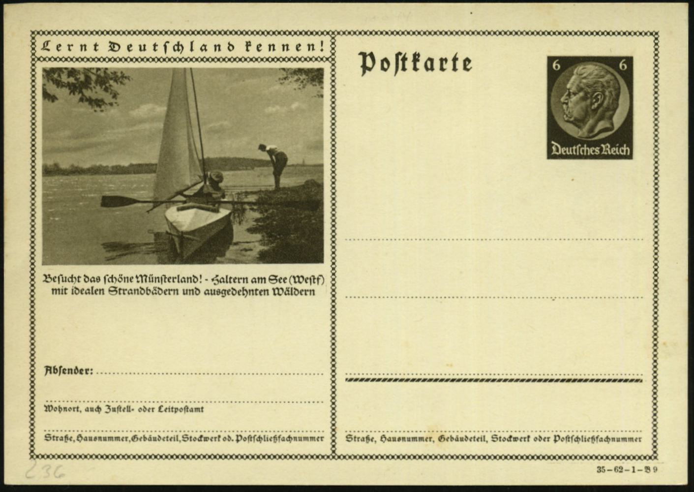 7471 | 10 € | PL-Raum 43.. (ohne Essen u. Mülheim/Ruhr) : Haltern am See (Westf) 1935 6 Pf. BiP Hindenbg., braun: Besucht das schöne Münsterland.. , Paddelboot mit Hilfssegel, ungebr., seltenes Motiv! (Mi.P 236/35-62-B 9) | ![]() | |