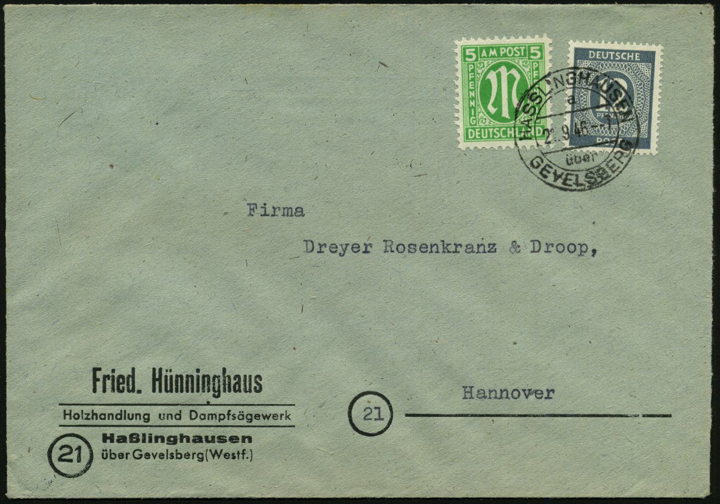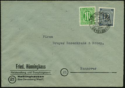 7472 | 14 € | PL-Raum 43.. (ohne Essen u. Mülheim/Ruhr) : HASSLINGHAUSEN/ a/ über/ GEVELSBERG 1946 (21.9.) 2K-Steg = PSt.I auf MiF Kontrollrat 12 Pf. + AM-Post 5 Pf. , klar gest. Firmen-Bf.: Fried. Hünninghaus, Holzhandlung u. Dampfsägewerk n. Hannover | ![]() | |