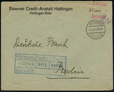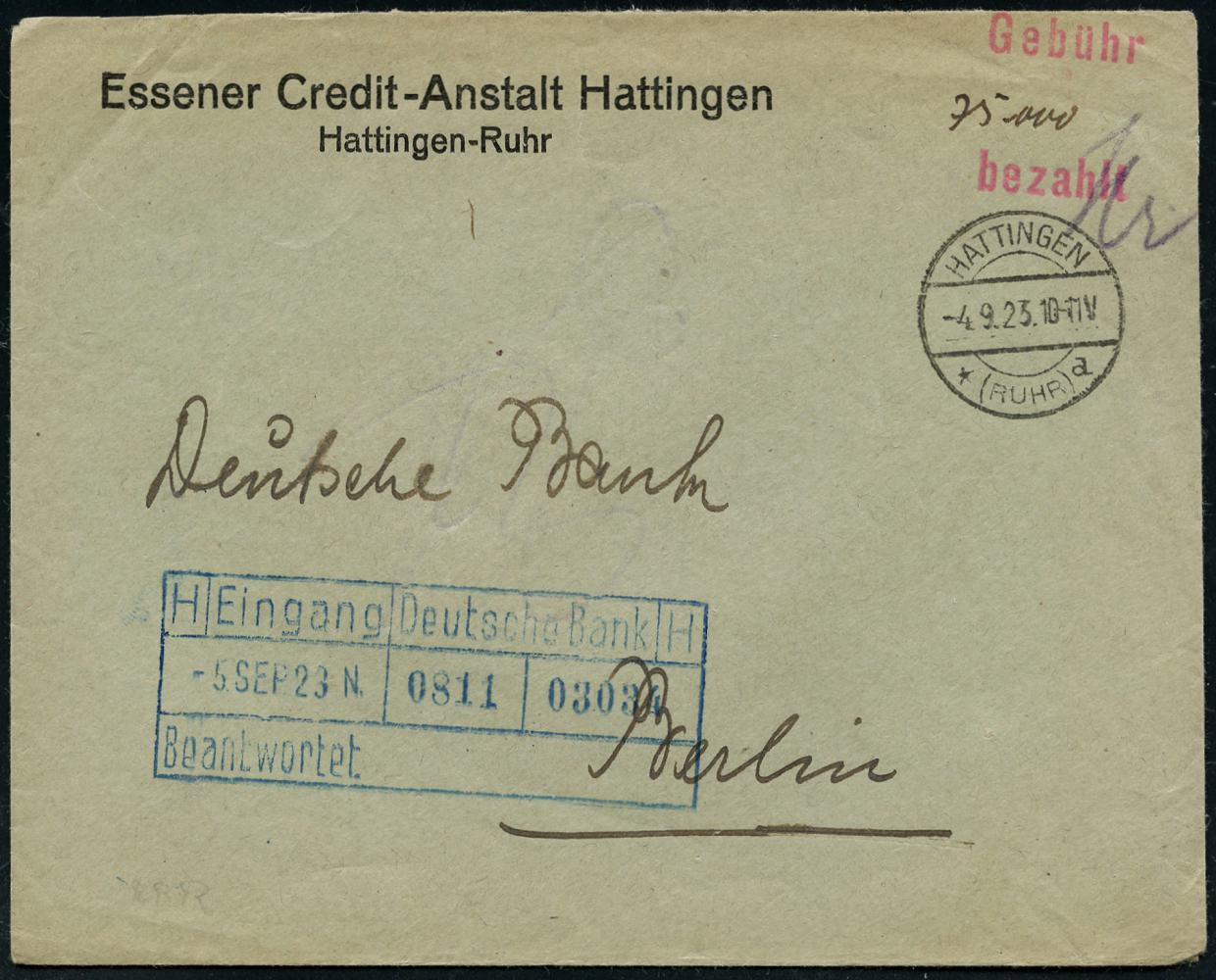 7474 | 18 € | PL-Raum 43.. (ohne Essen u. Mülheim/Ruhr) : HATTINGEN/ *(RUHR)/ d 1923 (4.9.) 1K-Brücke + roter 2L (weiter Abstand): Gebühr/bezahlt + hs. "75 000", Firmen-Bf.: Essener Credit-Anstalt, klar gest. Fern-Bf. n. Berlin | ![]() | |