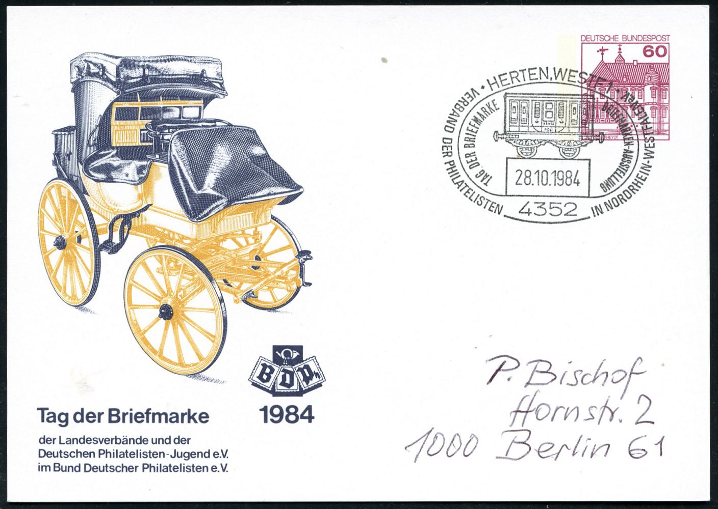 7484 | 8 € | PL-Raum 43.. (ohne Essen u. Mülheim/Ruhr) : 4352 HERTEN,WESTF 1/ TAG DER BRIEFMARKE 1984 (28.10.1984) SSt auf PP 60 Pf. "Tag der Briefmarke" (Postwagen) Inl.-Karte (Mi. PP 106/164 a) | ![]() | |