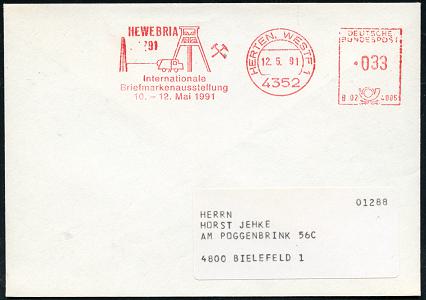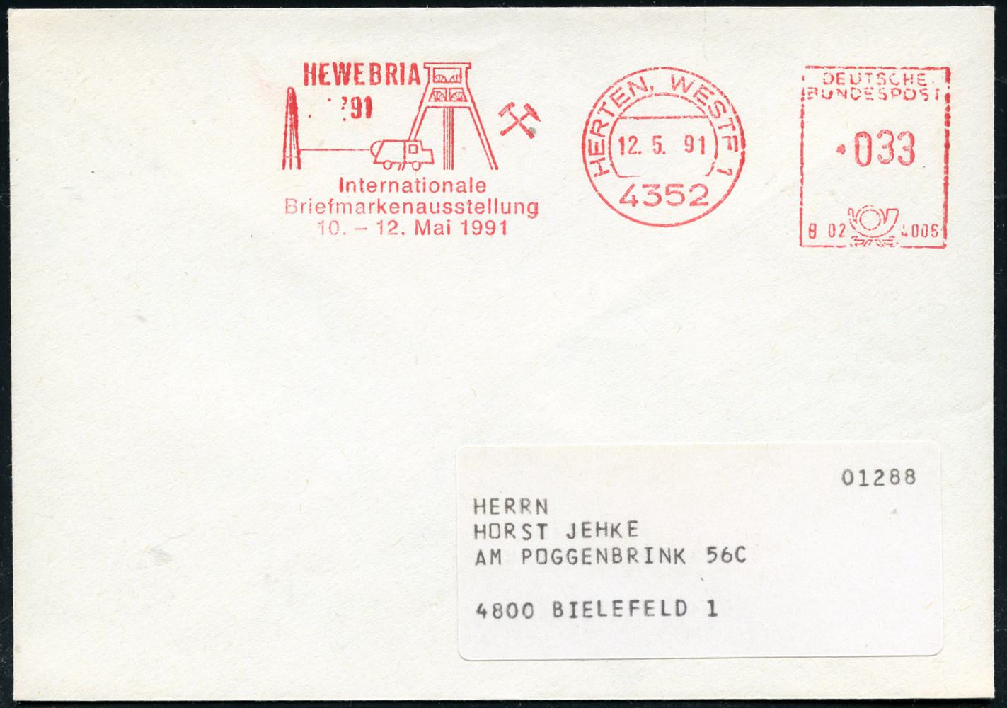 7485 | 12 € | PL-Raum 43.. (ohne Essen u. Mülheim/Ruhr) : 4352 HERTEN,WESTF 1/ B02 4005/ HEWEBRIA/ Internat./ Briefm.Ausstellung 1991 (12.5.) AFS Francotyp mit Kennung 033 Pf. = Massen-Drs. (Schachtanlage, Bohrturm) Inl.-Bf. (Dü.E-26) | ![]() | |