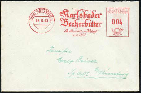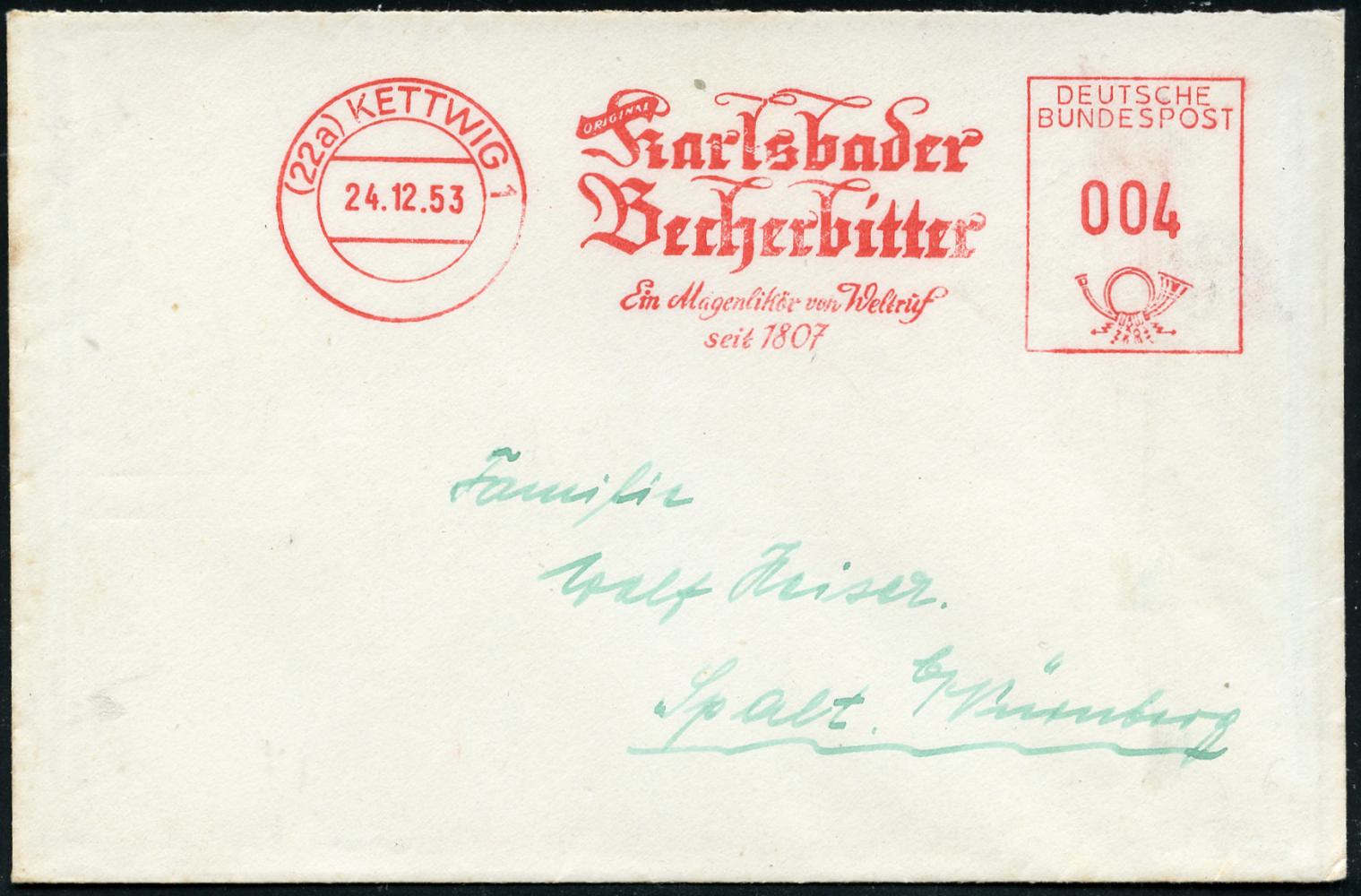 7486 | 12 € | PL-Raum 43.. (ohne Essen u. Mülheim/Ruhr) : (22a) KETTWIG 1/ Karlsbader/ Becherbitter/ Ein Magenlikör../ seit 1807 1953 (24.12.) AFS Francotyp auf Inl.-Bf. (rs. fehlt Klappe) klar gest.! (Dü.E-23CO) | ![]() | |