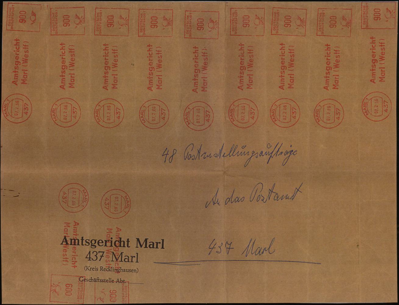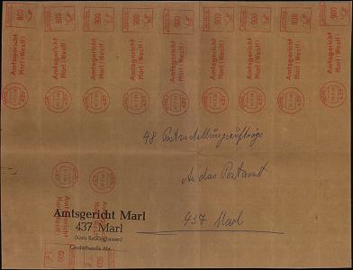 7492 | 35 € | PL-Raum 43.. (ohne Essen u. Mülheim/Ruhr) : 437 MARL1/ Amtsgericht 1966 (7.2.) AFS Francotyp 900 Pf. 10x + 600 Pf. 1x = 9600 Pf.! , großformatiger-Amtsgerichs-Orts-Post-ZU: "48 Postzustellungsaufträge" (zur Frankierung je quergefaltet) extrem hohe Portostufe!, sehr seltener Beleg! (Dü.E-23CO) | ![]() | |