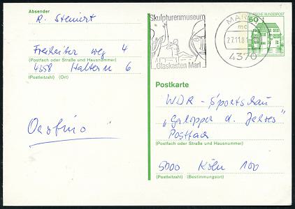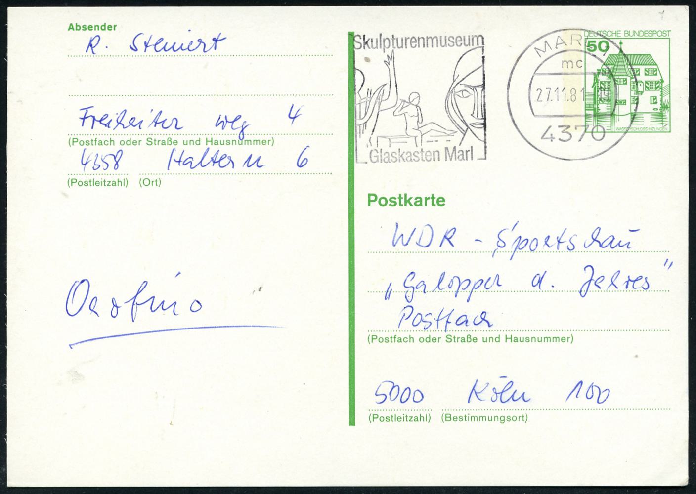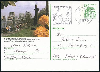7493 | 5 € | PL-Raum 43.. (ohne Essen u. Mülheim/Ruhr) : 4370 MARL 1/ mc/ Skulpturenmuseum/ Glasklasten 1981 (27.11.) MWSt = 3 Skulpturen , Bedarfs-Kt. | ![]() | |
