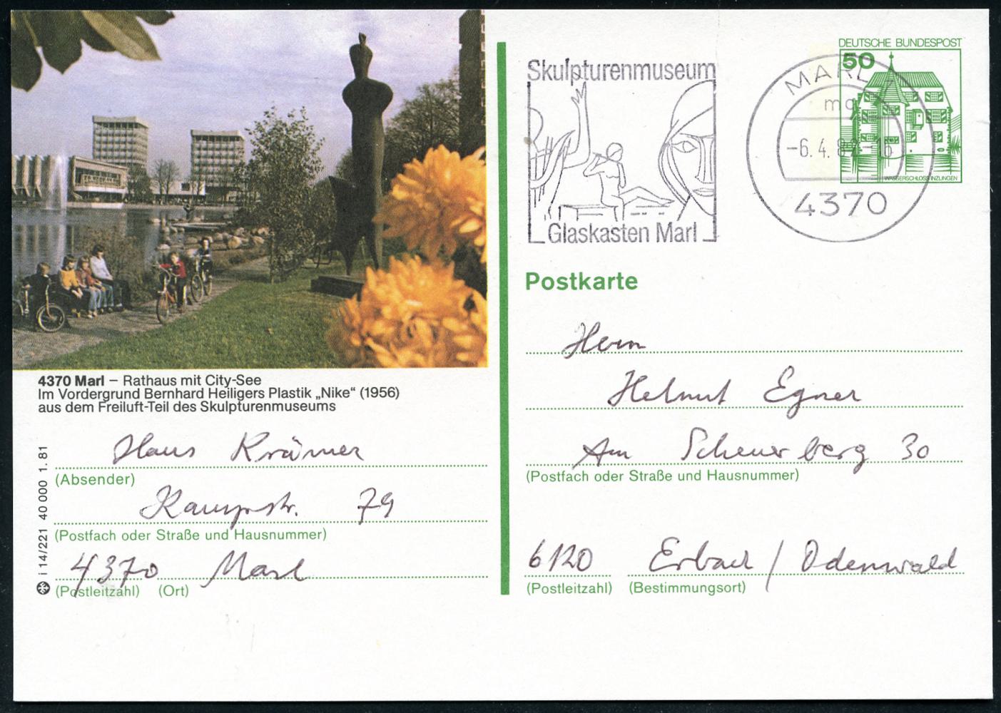 7494 | 15 € | PL-Raum 43.. (ohne Essen u. Mülheim/Ruhr) : 4370 MARL 1/ mc/ Skulpturenmuseum/ Glasklasten 1982 (6.4.) MWSt = 3 Skulpturen auf ortsgl. BiP 50 Pf. Burgen, grün: 4370 Marl.. Bernhard Heiligers Plastik "Nike" (1956) aus dem.. Skulpturenmuseum , Inl.-Kt., seltene Kombination! | ![]() | |