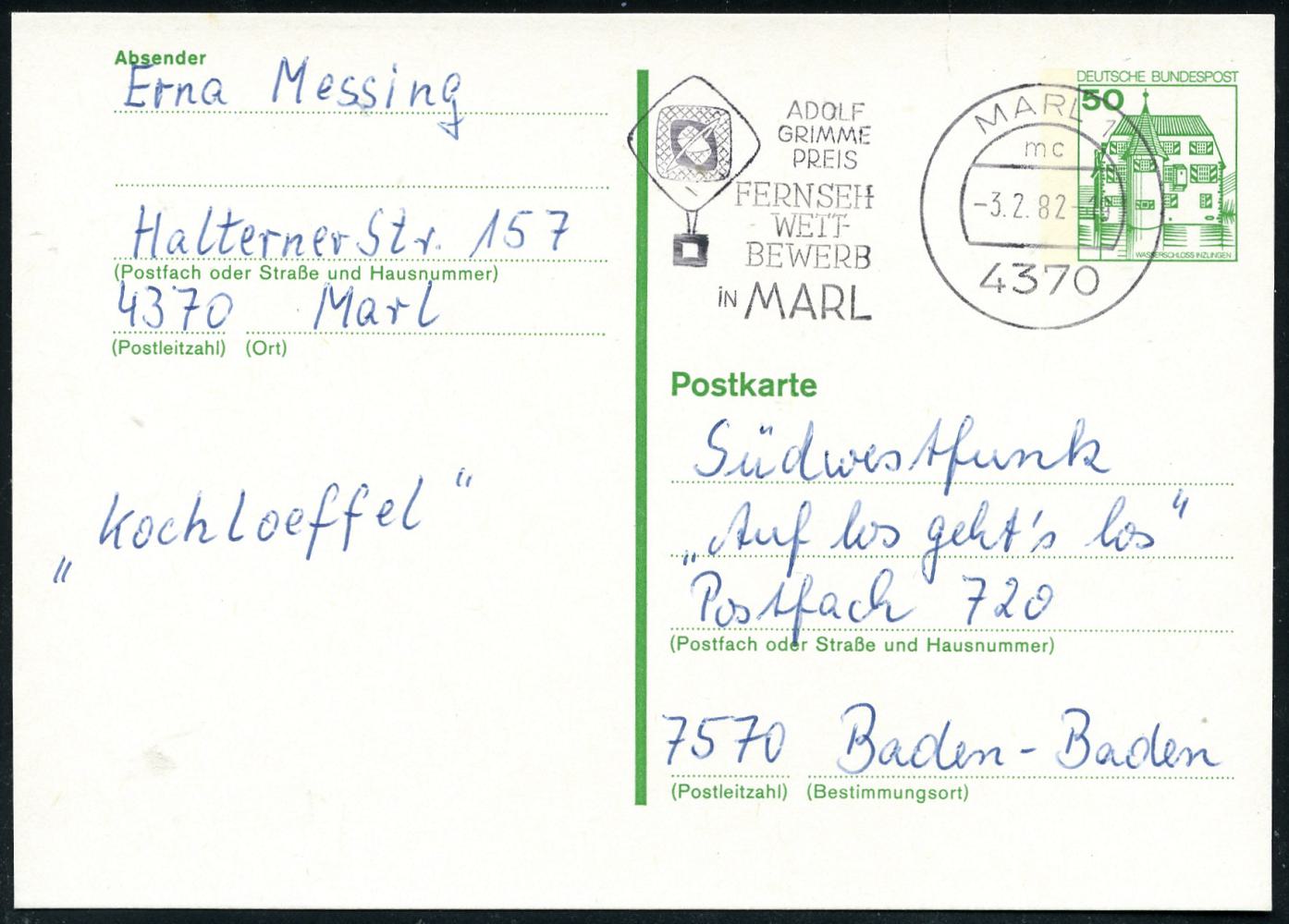 7495 | 5 € | PL-Raum 43.. (ohne Essen u. Mülheim/Ruhr) : 4370 MARL 1/ mc/ ADOLF/ GRIMME/ PREIS/ FERNSEH/ WETT/ BEWERB 1982 (3.2.) MWSt (Fernsehfilm-Preis) Bedarfs-Kt. | ![]() | |