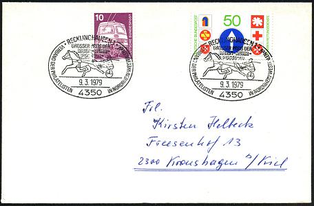 7505 | 12 € | PL-Raum 43.. (ohne Essen u. Mülheim/Ruhr) : 4350 RECKLINGHAUSEN 1/ GROSSER PREIS DER/ RHEIN-RUHR-/ POSTA.. 1979 (9.3.) SSt = Traber-Gespann , 2x klar gest. Inl.-Bf. | ![]() | |