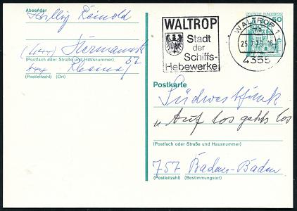 7511 | 6 € | PL-Raum 43.. (ohne Essen u. Mülheim/Ruhr) : 4355 WALTROP 1/ mb/ Stadt/ der/ Schiffs-/ Hebewerk 1979 (25.7.) MWSt (Wappen) Bedarfs-Kt. | ![]() | |