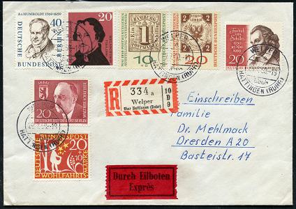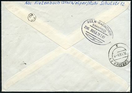7512 | 20 € | PL-Raum 43.. (ohne Essen u. Mülheim/Ruhr) : WELPER/ a/ über/ HATTINGEN (RUHR) 1959 (29.7.) 2K-Steg + RZ: Welper/über Hattingen (Ruhr)/a = PSt. I , rs. Bahn-Oval:: KÖLN-HANNOVER/ BAHNPOST/ ZUG 3053/dm, Inl.-Eil-R-Bf. n. Dresden, rs. AS (Mi. Frankatur + 15.- EUR) | ![]() ![]() | |