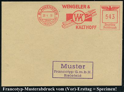7448 | 35 € | PL-Raum 43.. (ohne Essen u. Mülheim/Ruhr) : BLANKENSTEIN/ über/ HATTINGEN (RUHR)/ WENGELER &/ KALTHOFF 1938 (20.4.) AFS-Musterabdruck Francotyp "Reichsadler" = PSt. I-Typ (Monogr,-Logo u. Drehteile) glasklar gest. Francotyp-Musterblatt vom (Vor)-Ersttag !, selten! (Dü.E-5CGo) | ![]() ![]() | |