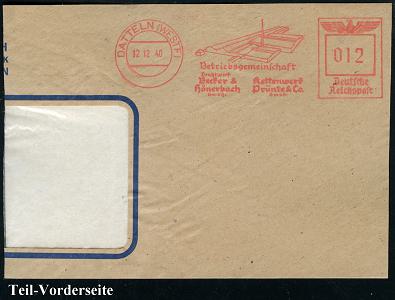 7452 | 15 € | PL-Raum 43.. (ohne Essen u. Mülheim/Ruhr) : DATTELN (WESTF)/ Betriebsgemeinschaft/ Drahtwerk/ Becker &/ Höhnerbach../ Kettenwerk/ Prünte & Co.. 1940 (12.12.) AFS Francotyp "Reichsadler" (Werksgelände) Teil-Vorderseite (Dü.E-5CGo) | ![]() | |