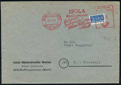 7473 | 15 € | PL-Raum 43.. (ohne Essen u. Mülheim/Ruhr) : (21b) HASSLINGHAUSEN/ über/ GEVELSBERG/ ISOLA/ ..hochwertige/ Jsoliermittel gegen/ Wäreme,Kälte u.Schall 1951 (11.9.) AFS Postalia = PSt.I-Typ auf 2 Pf. NoB = Vorausentwertung , Firmen-Bf.: Isola-Mineralwolle-Werke.. (Dü.E-23B) | ![]() | |