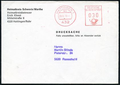 7479 | 12 € | PL-Raum 43.. (ohne Essen u. Mülheim/Ruhr) : 432 HATTINGEN 1/ sa/ DEUTSCHE/ BUNDESPOST 1978 (28.6.) PFS Hochrechteck "Posthorn" ohne Stundenangabe , Dienst-Bf.: Heimatkreis Schwerin/Warthe.. (Dü.D-17) | ![]() | |