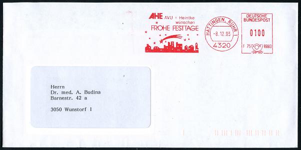 7481 | 10 € | PL-Raum 43.. (ohne Essen u. Mülheim/Ruhr) : 4320 HATTINGEN,RUHR 1/ AHE AVU + Heintke/ wünschen/ FROHE FESTTAG 1993 (8.12.) AFS Postalia mit Kennung = Thermodruck! (Ortssilhouette mit Komet) Fern-Bf. | ![]() | |