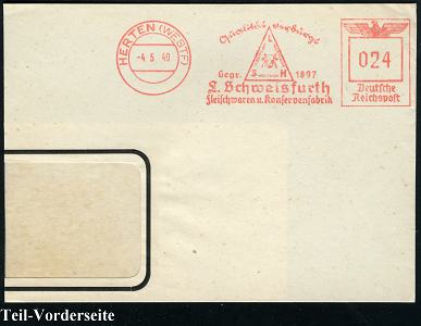7482 | 15 € | PL-Raum 43.. (ohne Essen u. Mülheim/Ruhr) : HERTEN (WESTF)/ Qualität verbürgt/ ..L.Schweisfurth/ Fleischwaren u.Konservenfabrik 1940 (4.5.) AFS Francotyp "Reichsadler", Text teils Sütterlin (Logo mit Kuhkopf) Teil-Vorderseite (Dü.E-5CGo) | ![]() | |