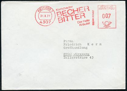 7487 | 10 € | PL-Raum 43.. (ohne Essen u. Mülheim/Ruhr) : 4307 KETTWIG 1/ GEBÜHR BEZAHLT/ Karlsbader/ BECHER/ BITTER/ Der helle/ Kräuter 1971 (31.8.) AFS Francotyp 007 Pf. = Massen-Drs. , Inl.-Bf. (Dü.E-23CO) | ![]() | |