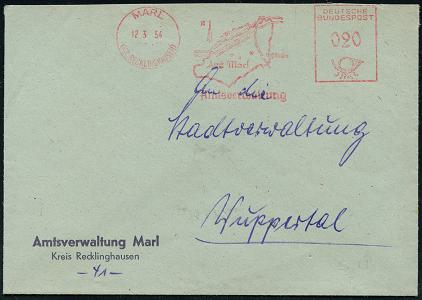 7490 | 10 € | PL-Raum 43.. (ohne Essen u. Mülheim/Ruhr) : MARL/ (KR.RECKLINGHAUSEN)/ ..Amtsverwaltung 1954 (12.3.) genormter AFS Francotyp mit ungenormten Klischee (Landkarte) auf Dienst-Bf.: Amtsverwaltung Marl.. (Dü.E-23CEo) | ![]() | |