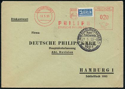 7500 | 18 € | PL-Raum 43.. (ohne Essen u. Mülheim/Ruhr) : (21a) RECKLINGHAUSEN/ Ruhr-/ Festspiele/ 1955.. 1955 (21.5.) HWSt als Aufgabe-Stpl. auf vorausfrankiertem Firmen-Bf. mit AFS.: (21 b) DORTMUND/PHILIPS.. auf 2 Pf. NoB = Vorausentwertung! (Firmenlogo des Elektrokonzerns, Bf. Mittelfalte, da Antwort-Bf.) n. Hamburg | ![]() | |