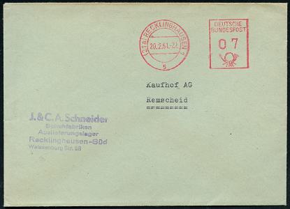 7501 | 14 € | PL-Raum 43.. (ohne Essen u. Mülheim/Ruhr) : (21a) RECKLINGHAUSEN 1/ s/ DEUTSCHE/ BUNDESPOST 1961 (20.2.) PFS Hochrechteck "Posthorn" 07 Pf. + Abs.-4L: J. & C. A. Schneider, Schufabriken.. (Dü.D-17) | ![]() | |