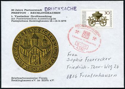 7503 | 10 € | PL-Raum 43.. (ohne Essen u. Mülheim/Ruhr) : 4350 RECKLINGHAUSEN 1/ 1.Vestischer Großtauschtag.. 1976 (18.9.) r o t e r SSt (Bergbauhämmer) auf passendem Sonderumschlag | ![]() | |