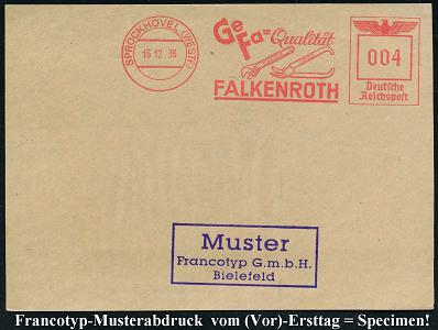 7506 | 35 € | PL-Raum 43.. (ohne Essen u. Mülheim/Ruhr) : SPROCKHÖVEL (WESTF)/ GeFa-Qualität/ FALKENROTH 1935 (16.12.) AFS-Musterabdruck Francotyp "Reichsadler" (Werkzeuge) glasklar gest. Francotyp-Musterblatt vom (Vor)-Ersttag !, selten! (Dü.E-5CGo) | ![]() ![]() | |