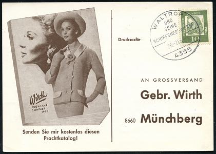 7508 | 14 € | PL-Raum 43.. (ohne Essen u. Mülheim/Ruhr) : 4355 WALTROP/ UND/ SEINE/ SCHIFSHEBEWERKE 1965 (26.2.) HWSt auf Reklame-Kt.: Gebr, Wirth, Frauenmode = Antwort-Kt. (Gutschein) n. Münchberg (Bo.1) | ![]() | |