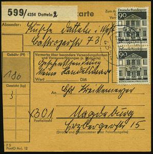 7454 | 15 € | PL-Raum 43.. (ohne Essen u. Mülheim/Ruhr) : 4354 DATTELN 2/ a 1971 (23.3.) 1K-Segment + hs. geänderter Paketzettel: 4354 Datteln 1 ,hs. in "2" geändert, Paar 90 Pf. Königsbg. Inl.-Paketkt. n.Magdeburg (Mi.499, MeF + 10.- EUR) | ![]() | |