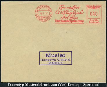 7447 | 35 € | PL-Raum 43.. (ohne Essen u. Mülheim/Ruhr) : BLANKENSTEIN/ über/ HATTINGEN (RUHR)/ Jhr nächstes/ Ausflugsziel:/ das schöne/ Amt Blankenstein-Ruhr 1937 (8.7.) AFS-Musterabdruck Francotyp "Reichsadler", Text teils Sütterlin = PSt. I-Typ , glasklar gest. Francoty-Musterblatt vom (Vor)-Ersttag !, selten! (Dü.E-5CG) | ![]() ![]() | |