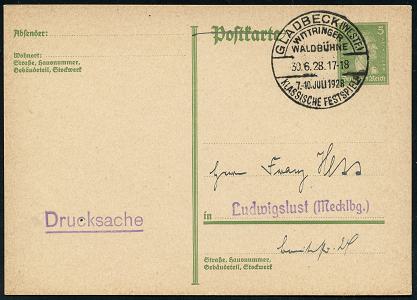 7460 | 22 € | PL-Raum 43.. (ohne Essen u. Mülheim/Ruhr) : GLADBECK (WESTF.)/ WITTRINGER/ WALDBÜHNE/ KLASSISCHE FESTSPIELE 1928 (30.6.) seltener HWSt klar auf Inl.-Karte (Bo.1, nur 1928 verwendet!) | ![]() | |
