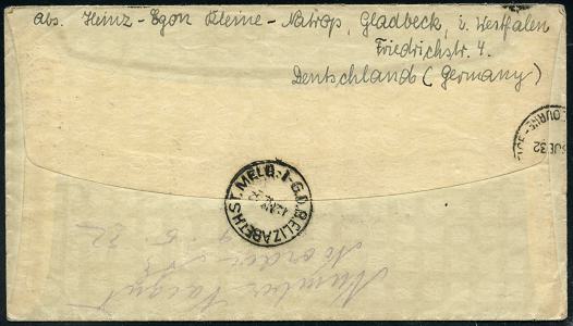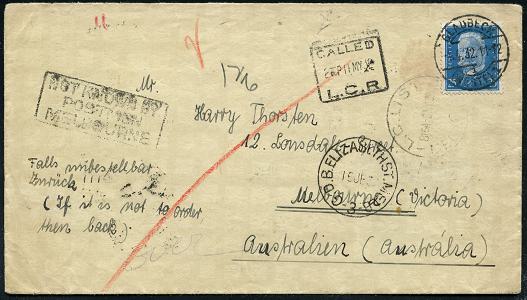 7461 | 30 € | PL-Raum 43.. (ohne Essen u. Mülheim/Ruhr) : GLADBECK/ (WESTF.) 1 1932 (4.4.) 1K-Brücke auf EF 25 Pf. Hindenbg., blau + schw. Ra.3: CALLED--L.C.R. + schw. Ra.3: NOT KNOWN BY/POSTMAN/MELBOURNE , klar gest. Ausl.-Retour-Bf. n. Melbourne, div. AS/TS. sehr seltene Destination! (Mi.416 EF) | ![]() ![]() | |