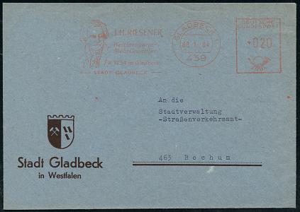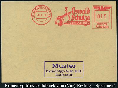 7462 | 35 € | PL-Raum 43.. (ohne Essen u. Mülheim/Ruhr) : GLADBECK (WESTF)1/ Oswald/ Schulze/ INSTALLATIONEN 1939 (8.3.) AFS-Musterabdruck Francotyp "Reichsadler" (gr.Wasserröhre am Kranhaken) glasklar gest. Francotyp-Musterabdruck vom (Vor)-Ersttag !, selten! (Dü.E-5CGo) | ![]() ![]() | |