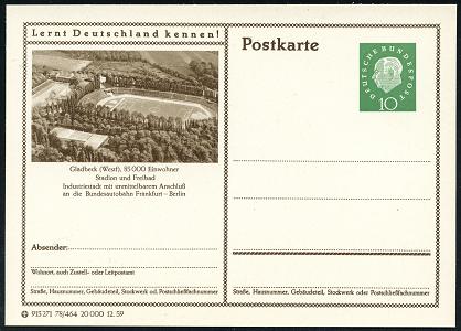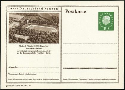 7466 | 10 € | PL-Raum 43.. (ohne Essen u. Mülheim/Ruhr) : Gladbeck 1959 2 verschied. BiP 10 Pf. Heuss III, grün: Fußball-Stadion , je ungebr. (Einzelverkauf möglich: je. 6.- EUR) 2 Belege (Mi.P 41/67-394, P 42/78-464) | ![]() ![]() | |