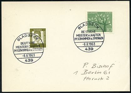 7467 | 12 € | PL-Raum 43.. (ohne Essen u. Mülheim/Ruhr) : 439 GLADBECK/ DEUTSCHE/ MEISTERSCHAFTEN/ IM SCHWIMMEN u.SPRINGEN 1963 (8.8.) SSt , 2x klar gest. Inl.-Karte (Bo.7) | ![]() | |