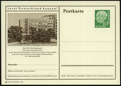 7491 | 6 € | PL-Raum 43.. (ohne Essen u. Mülheim/Ruhr) : Marl 1955 10 Pf. BiP Heuss I, grün: Die Paracelsusklinik , ungebr. (Mi.P 24/224) | ![]() | |
