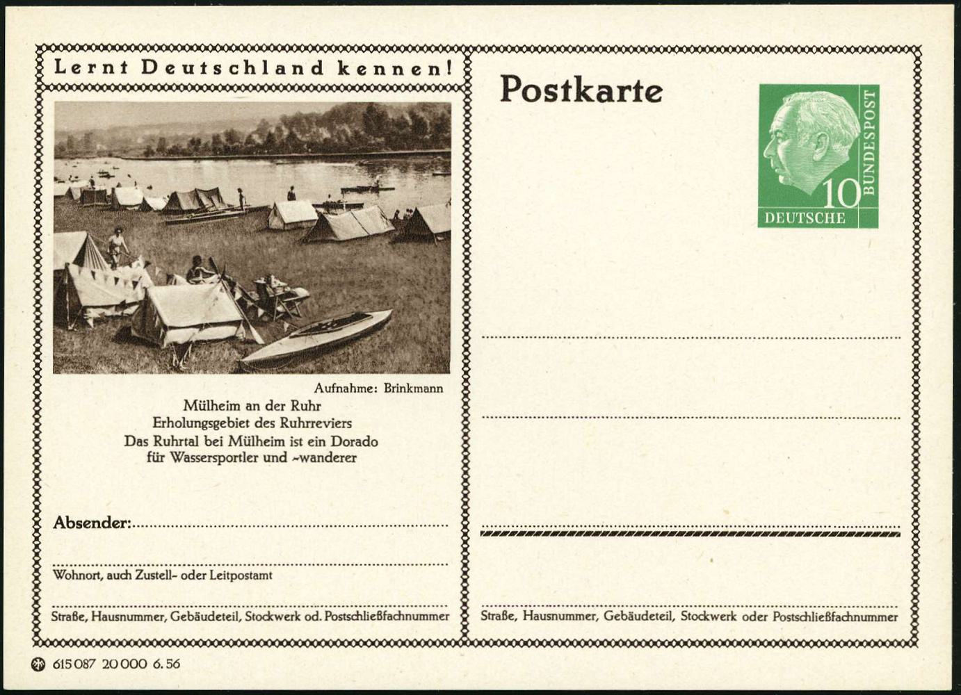 7541 | 8 € | 4330 Mülheim / Ruhr : Mülheim a.d.Ruhr 1956 10 Pf. BiP Heuss I, grün: ..Dorado für Wassersportler u.-wanderer = Zeltplatz mit Kajaks , ungebr. (Mi.P 24/214) | ![]() | |