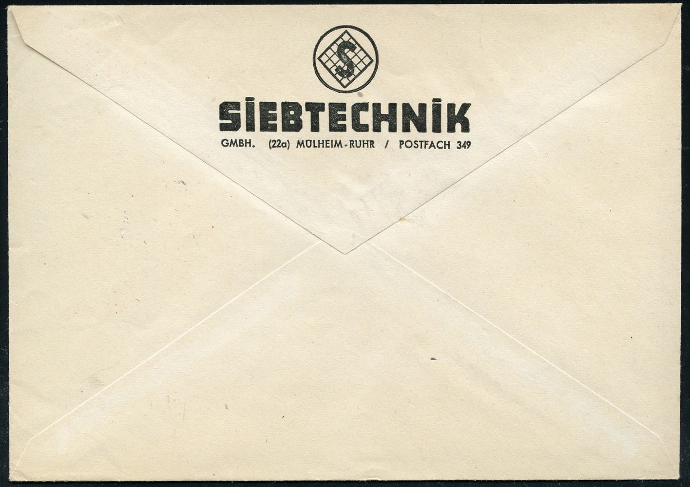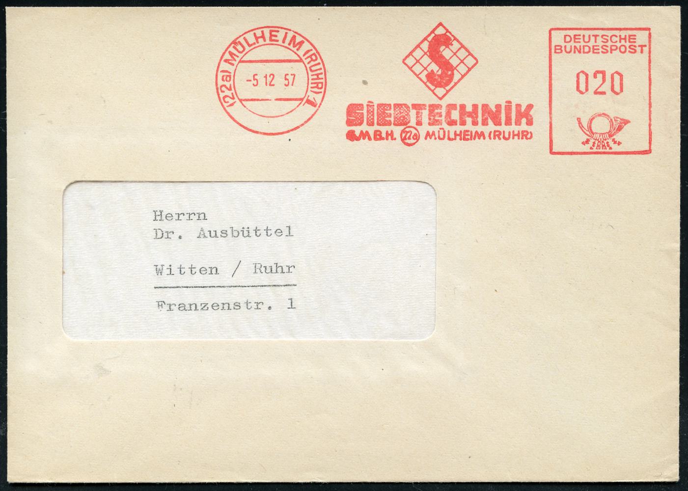 7542 | 14 € | 4330 Mülheim / Ruhr : (22a) MÜLHEIM (RUHR)1/ SIEBTECHNIK/ GMBH 1957 (5.12.) AFS Francotyp "Posthorn" (techn. Sieb) klar!, rs. motivgl. Abs.-Vordruck, Fern-Bf. (Dü.E-23CG) | ![]() ![]() | |