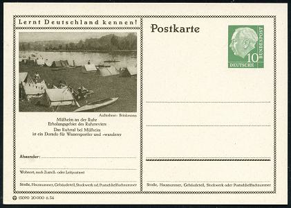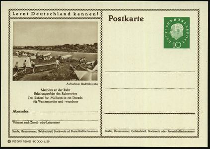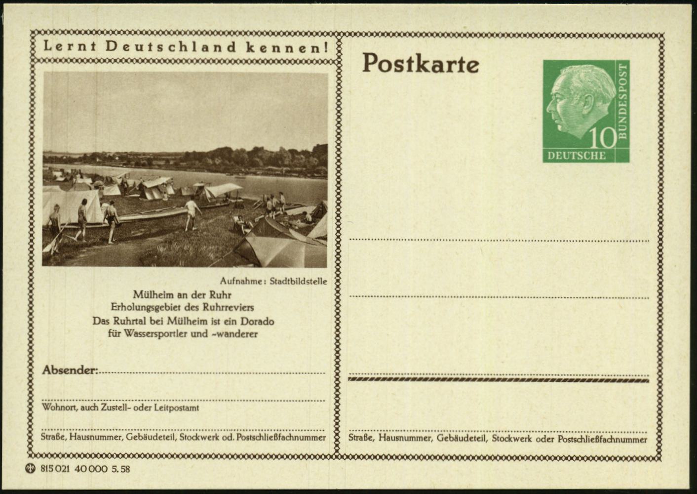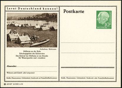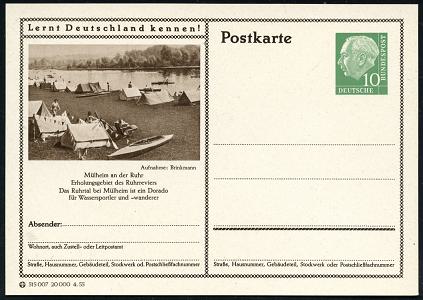 7539 | 8 € | 4330 Mülheim / Ruhr : Mülheim a.d.Ruhr 1955 10 Pf. BiP Heuss I, grün: ..Dorado für Wassersportler u. -wanderer = Campingplatz m.Kajaks , ungebr. (Mi.P 24/152) | ![]() | |