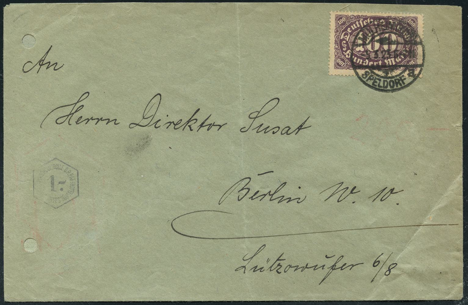 7516 | 25 € | 4330 Mülheim / Ruhr : MÜLHEIM (RUHR)-/ SPELDORF/ a 1923 (5.3.) 1K-Brücke auf EF 100 Mk. Ziffer (Mi.219 EF) + schw. 6eck: PORTO-CONTROLLE D.R. PAT./1.-/FIRMA "CUSTOS" DÜSSELDORF (gering undeutl., Bf. Mittelfalte, Reg.-Lochung geschl.) seltener Fern-Bf. n. Berlin (Dü.12 B) | ![]() | |