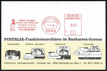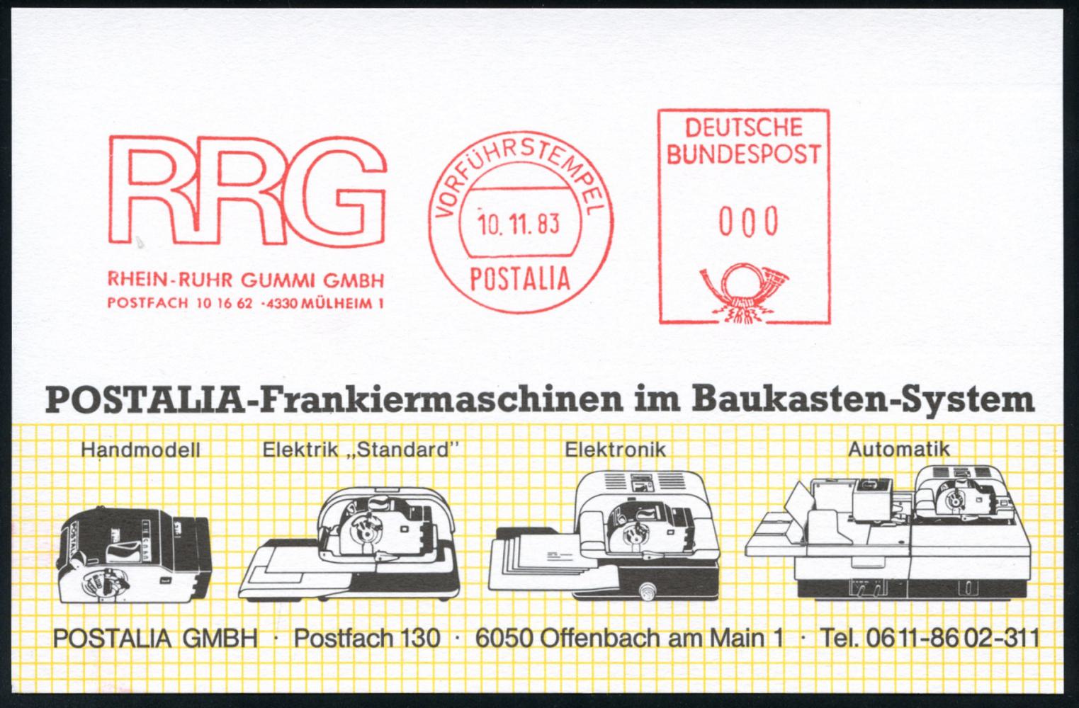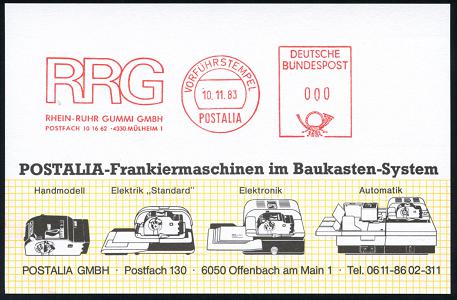 7554 | 18 € | 4330 Mülheim / Ruhr : 4330 Mülheim 1 1983 (10.11.) AFS.: VORFÜHRSTEMPEL/POSTALIA/ R R G / RHEIN-RUHR GUMMI GMBH , seltene Postalia-Muster-Kt. (= Specimen) | ![]() | |