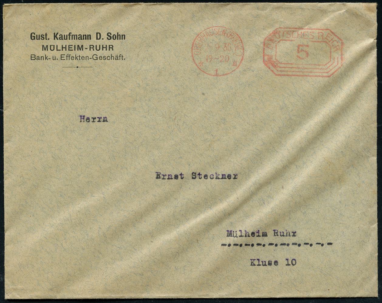 7517 | 10 € | 4330 Mülheim / Ruhr : Mülheim (Ruhr) 1930 (25.9.) Firmen-Bf.: Gust. Kaufmann D. Sohn.. Bank- u. Effekten-Geschäft mit Postfreistempel: OBERHAUSEN (RHEINL.)/* 1 III, 5 Pf. (Dü.D-4) | ![]() | |
