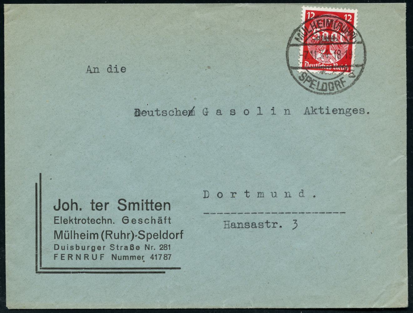 7518 | 16 € | 4330 Mülheim / Ruhr : MÜLHEIM (RUHR)-/ SPELDORF/ a 1934 (7.11.) 1K-Brücke glasklar auf EF 12 Pf. "Saar" auf Firmen-Bf.: Joh. ter Smitten, Elektrotechn. Geschäft.. (Mi.545 EF) | ![]() | |