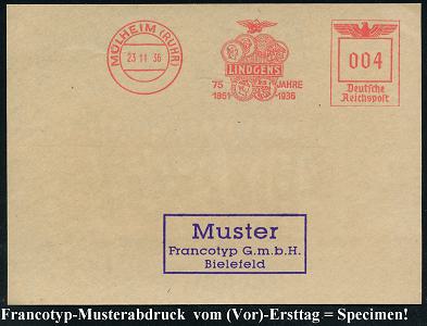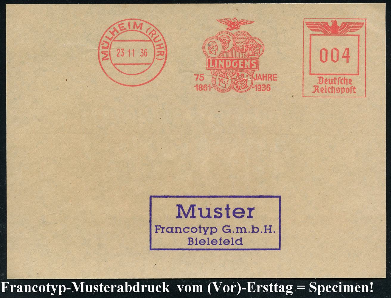 7519 | 35 € | 4330 Mülheim / Ruhr : MÜLHEIM (RUHR)/ LINDGENS/ 75 JAHRE/ 1861-1936 1936 (23.11.) AFS-Musterabdruck Francotyp "Reichsadler" (Adler über Medaillen) glasklar gest. Francotyp-Musterblatt vom (Vor)-Ersttag !, selten! (Dü.E-CGo) | ![]() ![]() | |