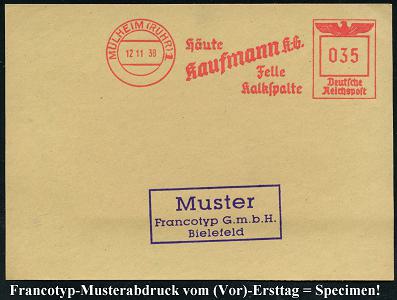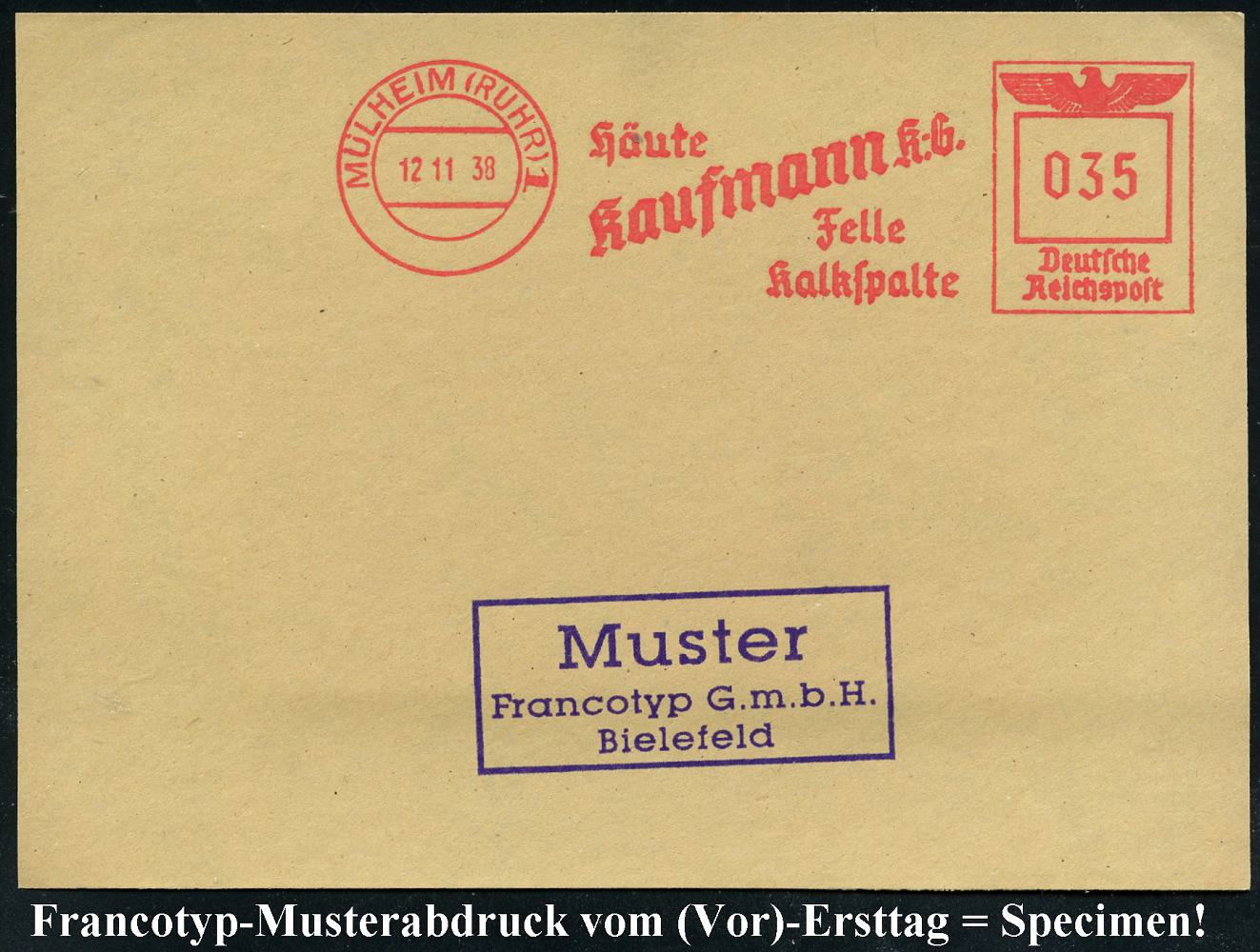 7525 | 35 € | 4330 Mülheim / Ruhr : MÜLHEIM (RUHR) 1/ Häute/ Kaufmann AG/ Felle/ Kalkspalte 1938 (12.11.) AFS-Musterabdruck Francotyp "Reichsadler" , glasklar gest. Francotyp-Musterblatt vom (Vor)-Ersttag !, selten! (Dü.E-5CGo) | ![]() ![]() | |