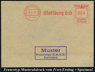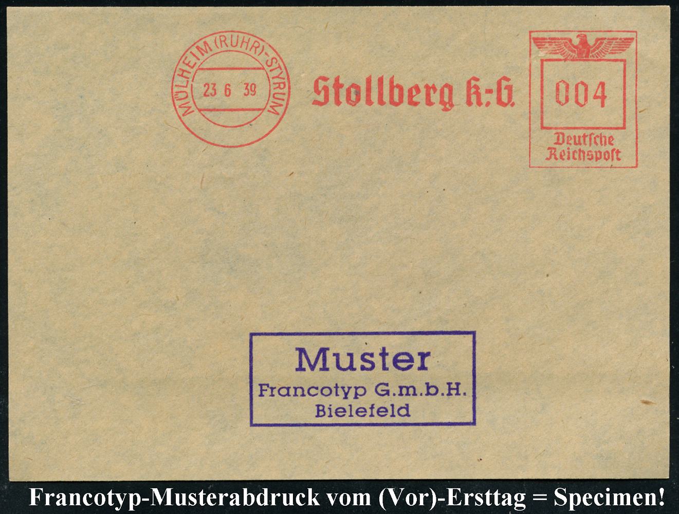 7527 | 35 € | 4330 Mülheim / Ruhr : MÜLHEIM (RUHR)-STYRUM/ Stolberg A-G 1939 (23.6.) AFS-Musterabdruck Francotyp "Reichsadler" , glasklar gest. Francotyp-Musterblatt vom (Vor)-Ersttag !, selten! (Dü.E-5CGo) | ![]() ![]() | |