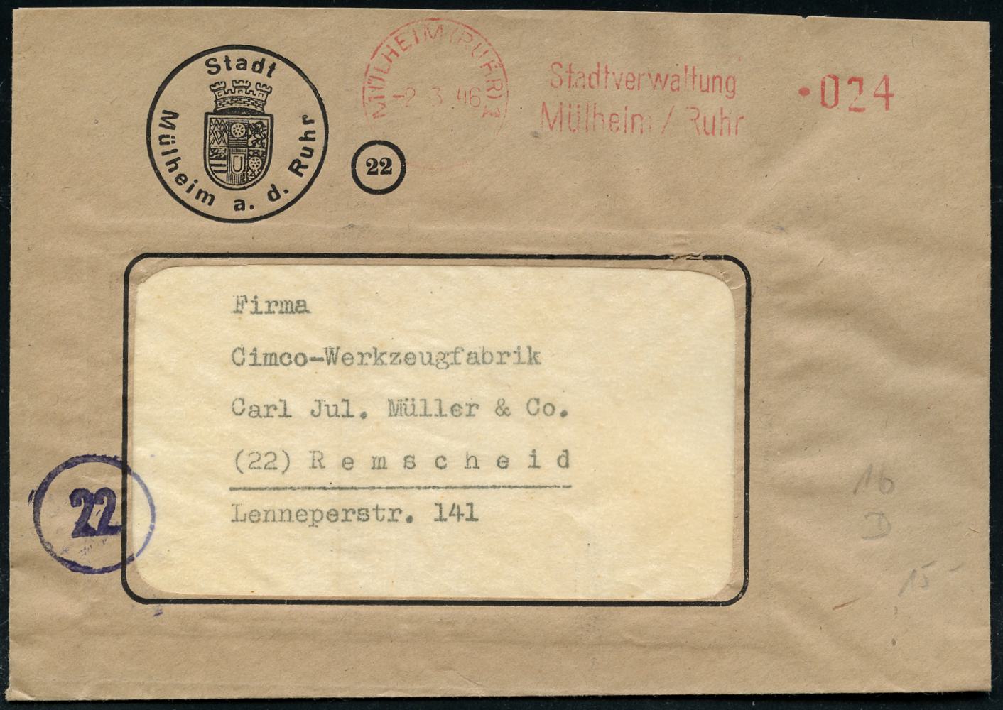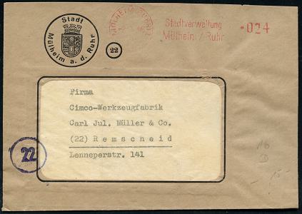 7530 | 25 € | 4330 Mülheim / Ruhr : MÜLHEIM (RUHR) 1/ Stadtverwaltung.. 1946 (2.3.) total aptierter AFS Francotyp = Wertrahmen komplett entfernt = Notmaßnahme! , Dienst-Fern-Bf.: Stadt Mühlheim a. d. Ruhr mit Stadtwappen (Dü.E-16-244o) | ![]() | |