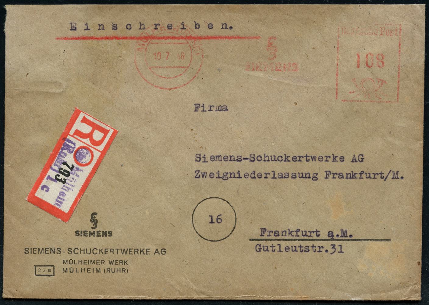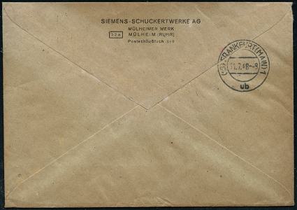 7533 | 18 € | 4330 Mülheim / Ruhr : MÜLHEIM (RUHR)/ SIEMENS 1948 (10.7.) AFS Francotyp "Posthorn" 108 Pf. + provis. RZ: (22 a) Mülheim/ (Ruhr) 1 c (Blanco-RZ zugestempelt) Firmen-R-Fern-Bf.: SIEMENS-SCHUCKERTWERKE AG.. (Monogr.-Logo) n. Ffm., rs. AS. (Dü.E-20CG) | ![]() ![]() | |