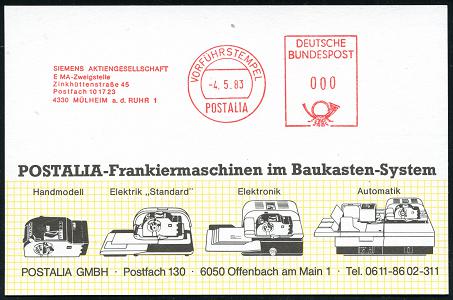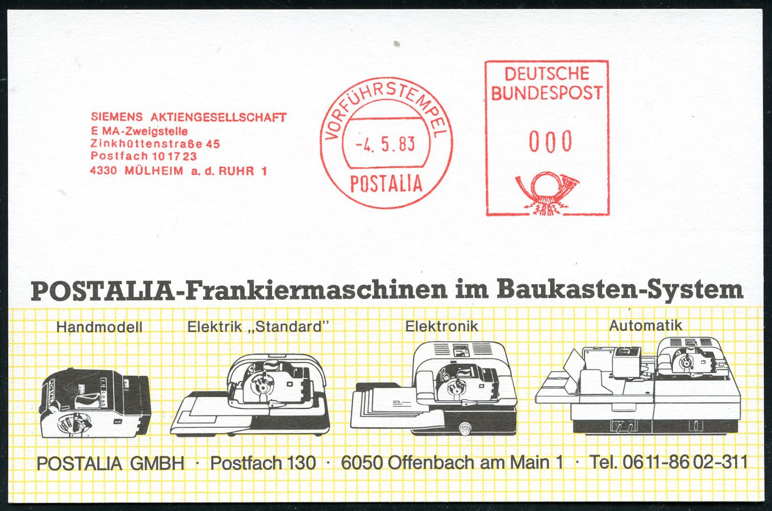 7553 | 18 € | 4330 Mülheim / Ruhr : 4330 MÜLHEIM a.d.RUHR 1 1983 (4.5.) AFS.: VORFÜHRSTEMPEL/POSTALIA/SIEMENS AG/E MA-Zweigstelle.. , seltene Postalia-Muster-Kt. (= Specimen) | ![]() | |
