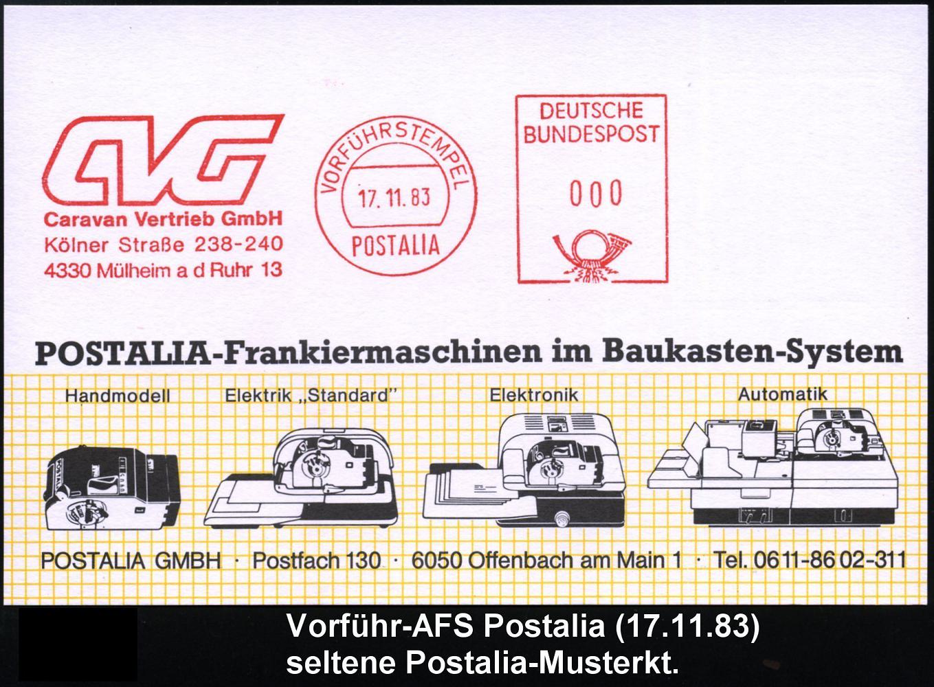 7555 | 18 € | 4330 Mülheim / Ruhr : 4330 Mülheim a.d.Ruhr 13 1983 (17.11.) AFS.: VORFÜHRSTEMPEL/POSTALIA/C V G/Caravan Vertrieb GmbH.. , seltene Postalia-Muster-Kt. (= Specimen) | ![]() | |