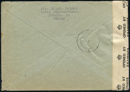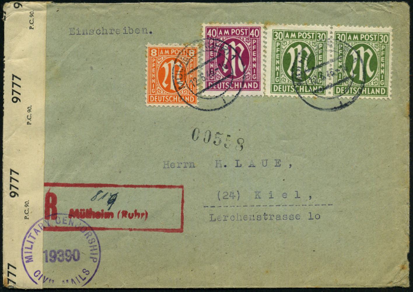 7529 | 25 € | 4330 Mülheim / Ruhr : MÜLHEIM (RUHR) 1/ i 1946 (12.6.) 2K-Steg auf 3-Farben-Frankatur AM-Post + rotviol. R - S t e m p e l: Mülheim (Ruhr) + hs. Nr. + brit. Zensurstreifen: OPENED BY/EXAMINER/9777 + viol. Zensur-1K: MILITARY CENSORSHIP/19390/CIVIL MAILS (bis Dez. 1946 = Bonn, Rie.B-5) Fern-Zensur-R-Br. n. Kiel | ![]() ![]() | |