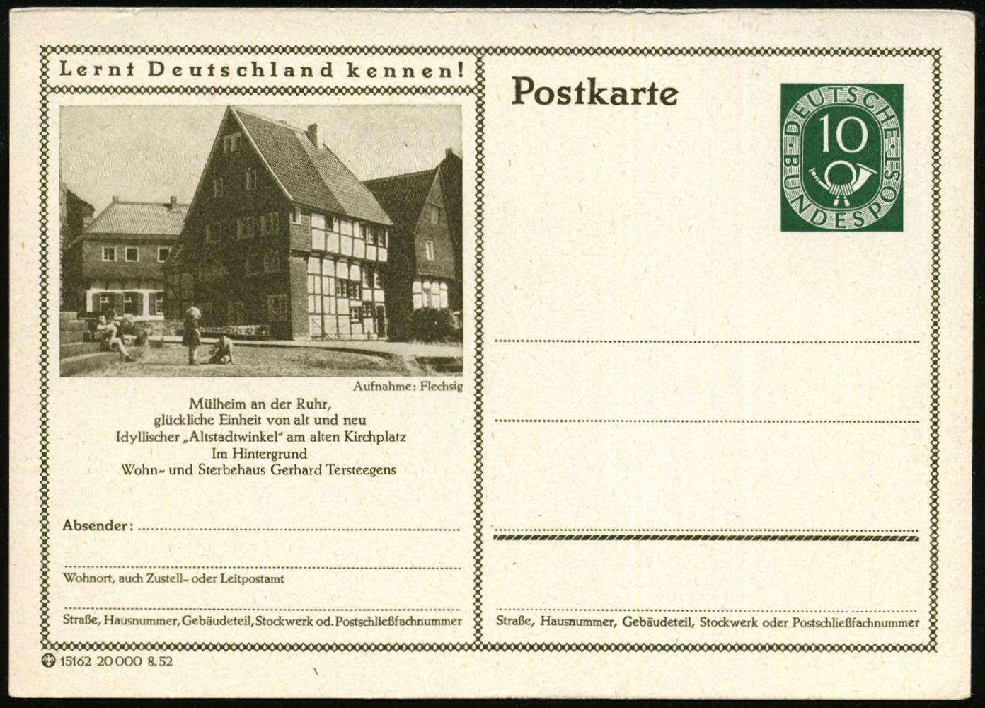 7535 | 16 € | 4330 Mülheim / Ruhr : Mülheim/ Ruhr 1952 10 Pf. BiP Posthorn: Wohn- u. Sterbehaus Gerhard Tersteegens = Pietist, Naturheiler, Dichter, Kirchen-musiker, Liederschreiber (z. B. "Ich bete an die Macht der Liebe!") ungebr. (Mi.P 17) | ![]() | |